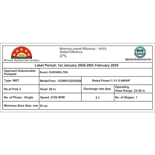 Euromolten 1.5Hp openwell submersible water pumps are designed to pump water with high suction capacity Specially for high elevation buildings and other small commercial water requirements. The open well Submersible water pumps from the house of Euro Molten are engineered to last long with high Quality product materials such as 100% Copper winding's, Dual carbon bush technology and stainless steel impeller etc.