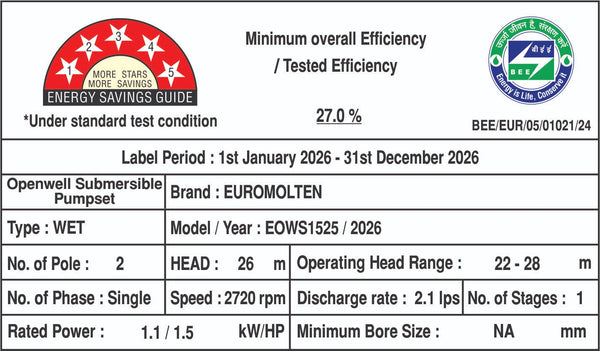 Euromolten 1.5Hp openwell submersible water pumps are designed to pump water with high suction capacity Specially for high elevation buildings and other small commercial water requirements. The open well Submersible water pumps from the house of Euro Molten are engineered to last long with high Quality product materials such as 100% Copper winding's, Dual carbon bush technology and stainless steel impeller etc.